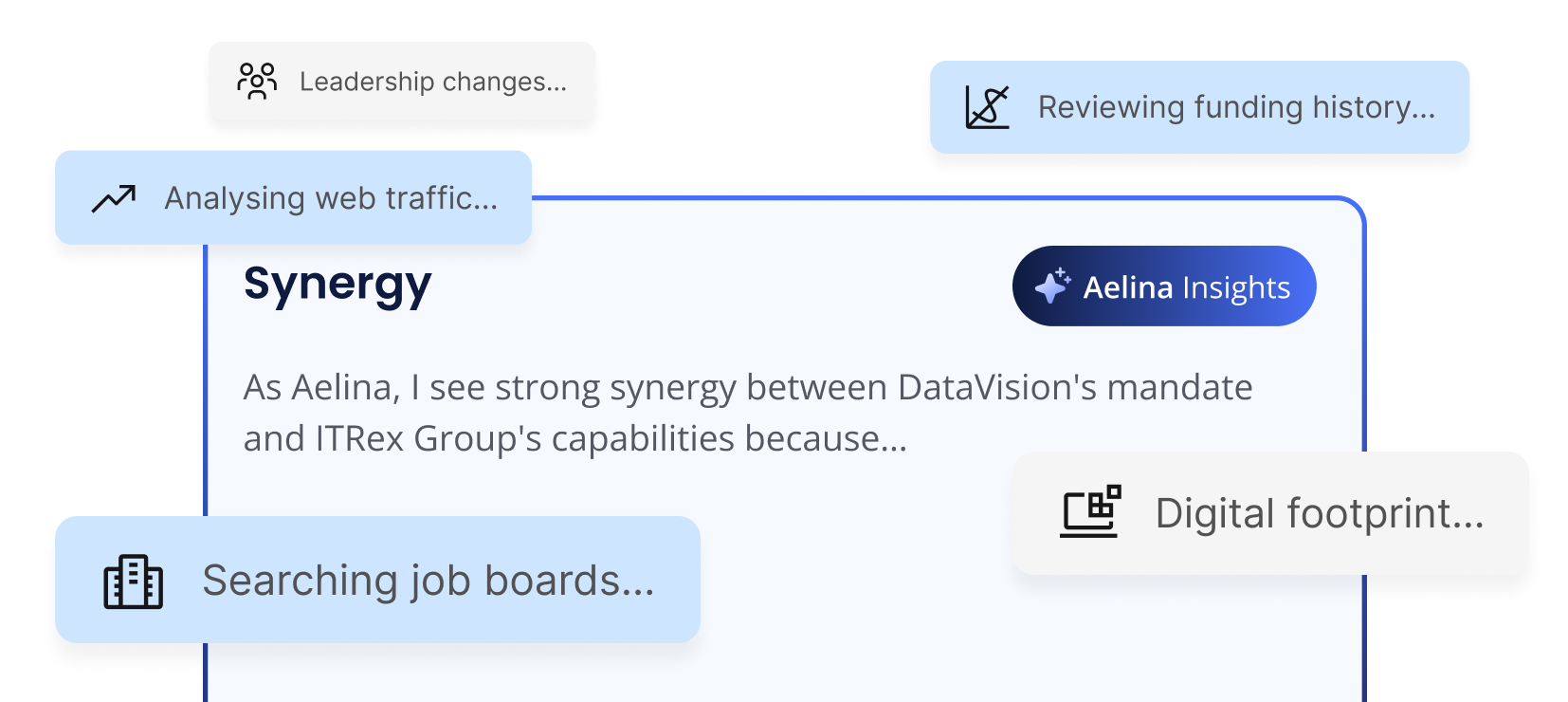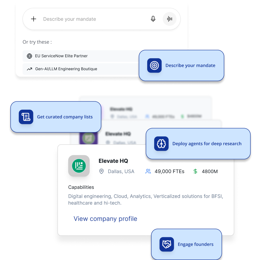 Our discovery engine pulls from job boards, web traffic, funding history, leadership changes and founder digital activity & much more to proactively identify high‑fit, off‑market targets.